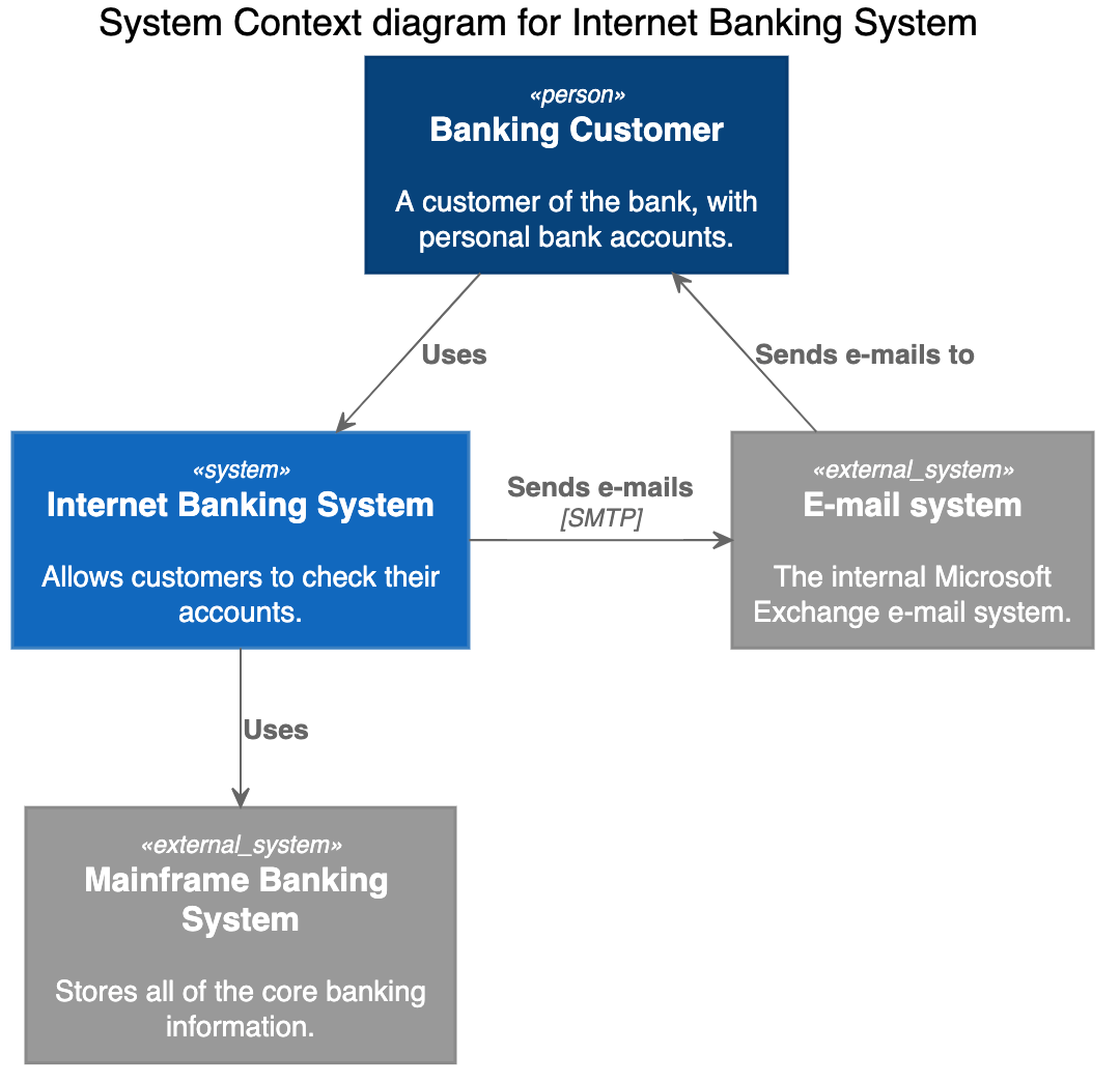 Rel(banking_system, mainframe, "Uses")