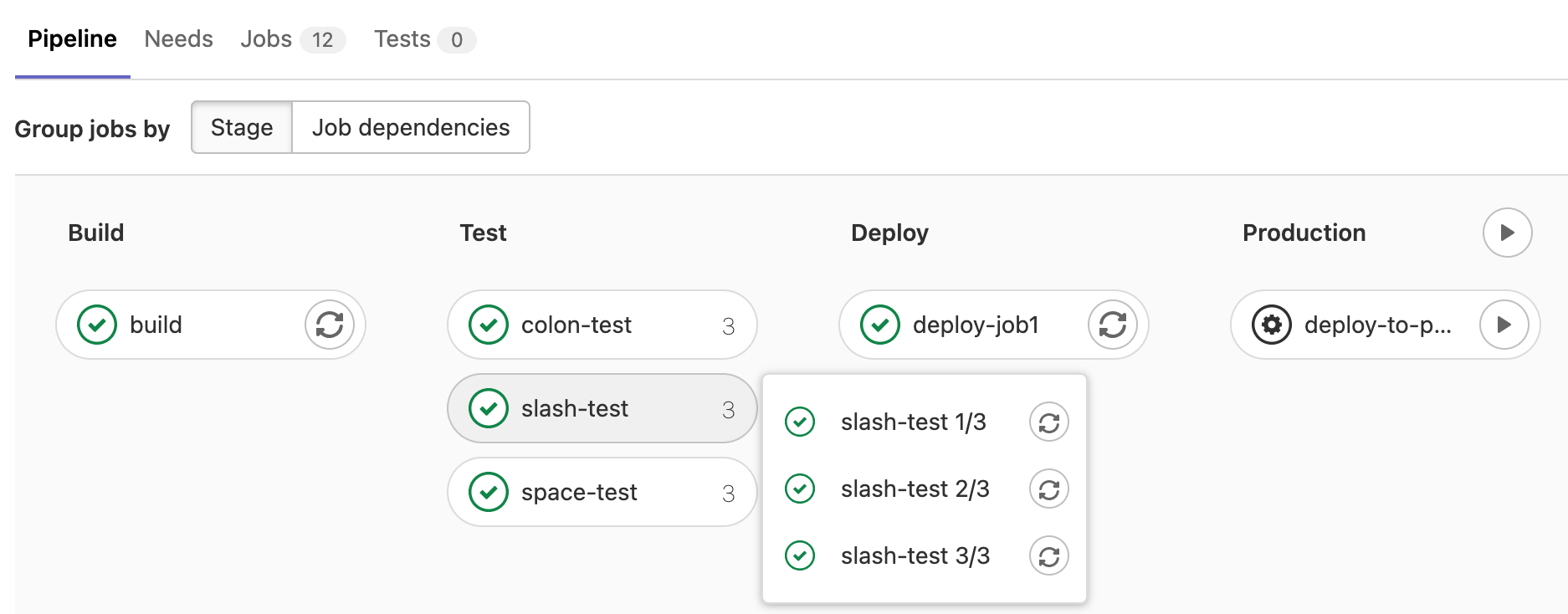 You can recognize when a pipeline has grouped jobs if you don't see the retry or cancel button inside them. Hovering over them shows the number of grouped jobs. Select to expand them.