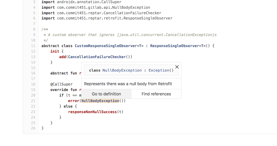 Sourcegraph provides code intelligence features, natively integrated into the GitLab UI.