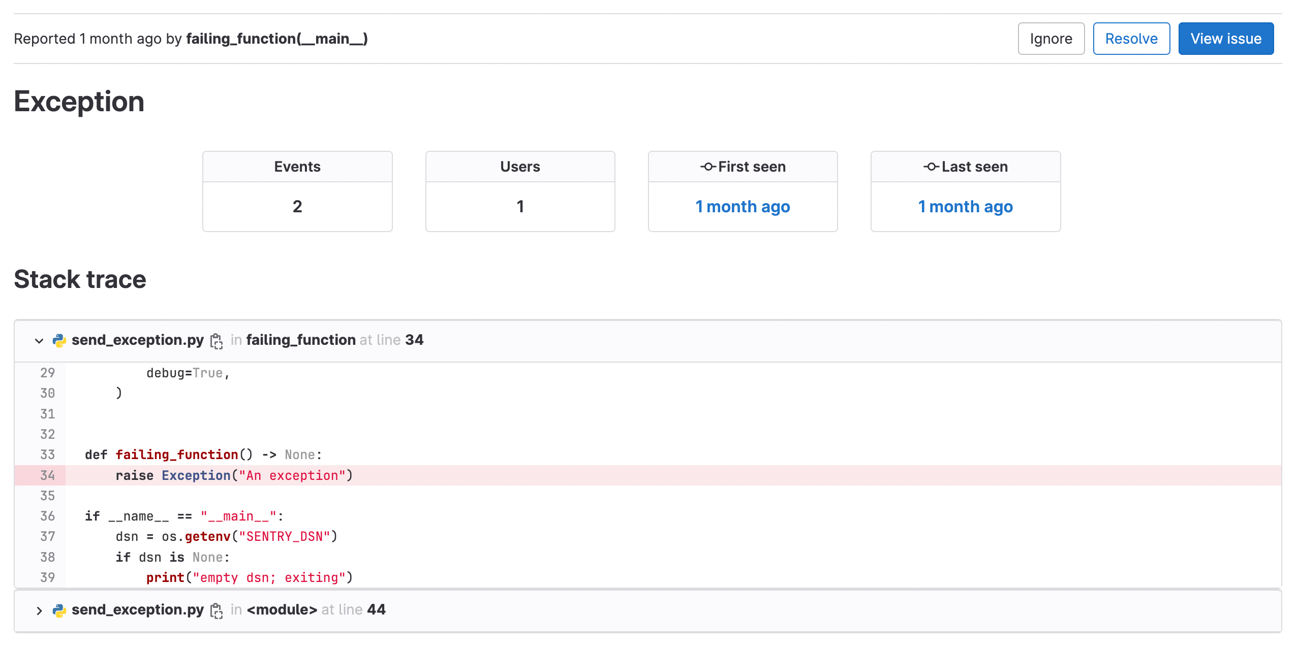 In the Error Details view you can see more details of the exception, including number of occurrences, users affected, first seen, and last seen dates.