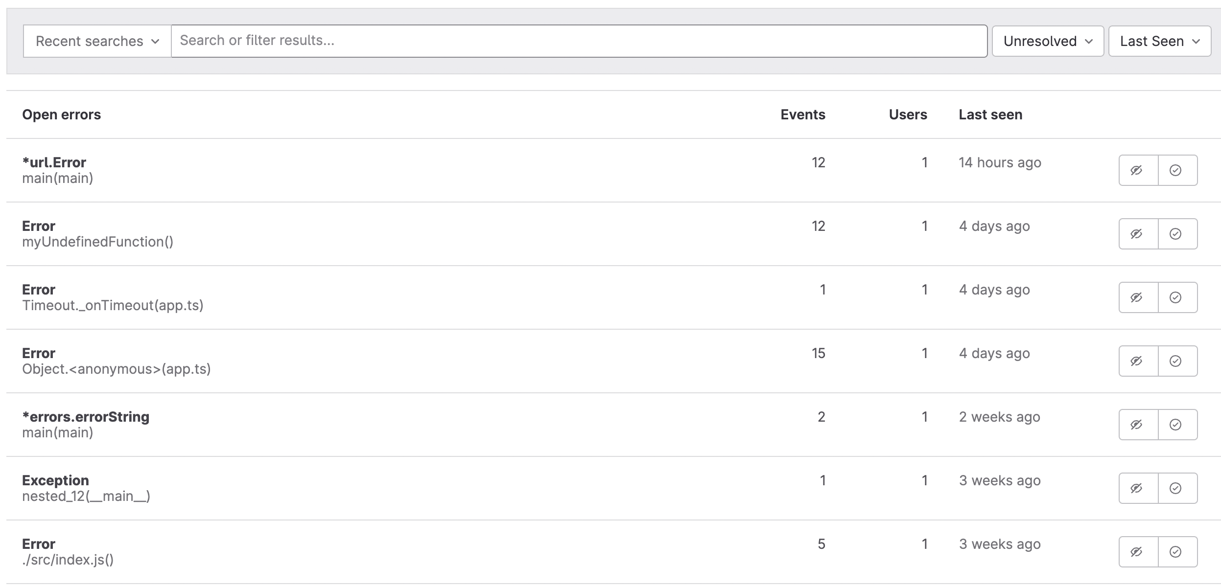 Whatever backend you choose, the error tracking UI is the same.