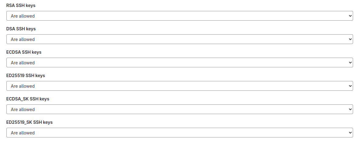 Similarly, certain standards groups recommend using RSA, ECDSA, ED25519, ECDSA_SK, or ED25519_SK over the older DSA, and administrators may need to limit the allowed SSH key algorithms.