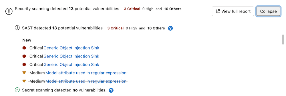 When a security report generated for a merge request becomes outdated, the merge request shows a warning message in the security widget and prompts you to take an appropriate action.