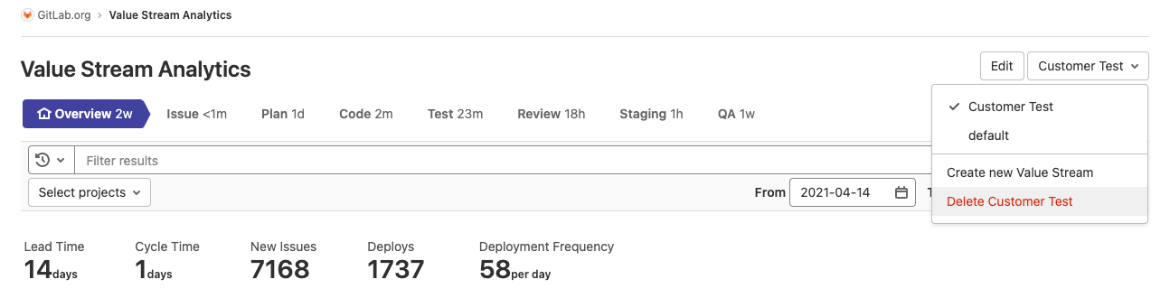 - On GitLab Premium, value stream analytics aggregates data and applies the date range filter on the end event. You can also create, edit, and delete value streams.