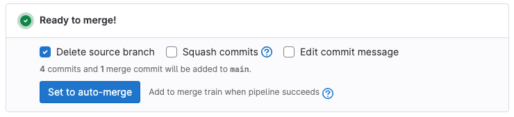 NOTE: In GitLab 16.0 and later, Merge when pipeline succeeds and Add to merge train when pipeline succeeds are renamed Set to auto-merge.