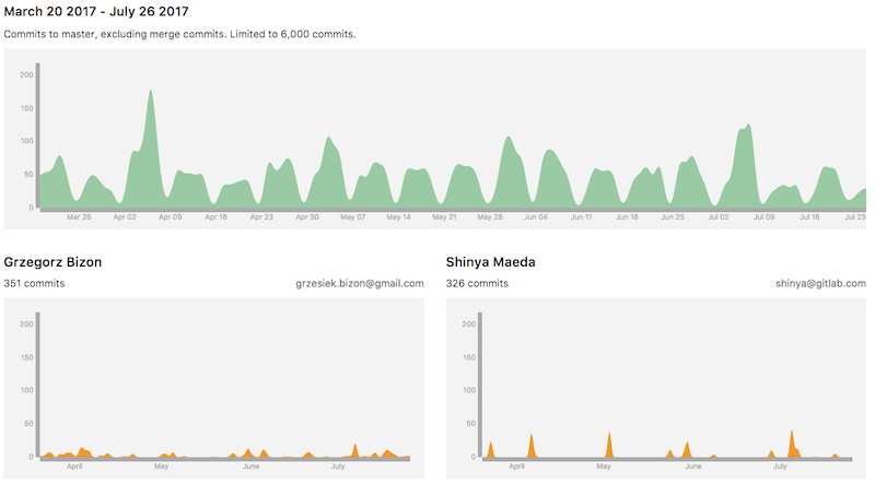 The graph shows the contributor with the most commits to the fewest.